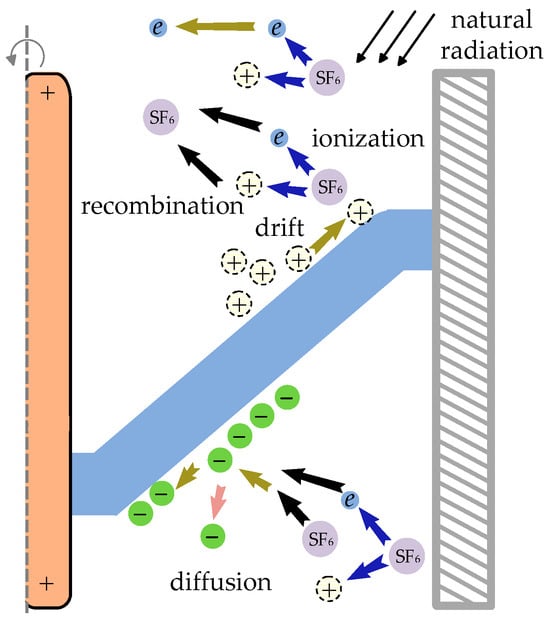 The calculation of the ion current in SF6 introduces the kinematic processes of radiative ionization, complexation, drift, and diffusion of charge carriers (Figure 2). In addition, only positive and negative ions are considered in the simulation to reduce computational complexity and improve model convergence performance []. The charge drift motion on the gas side is maintained by the electric field, while the diffusive motion is due to the local difference in charge carrier density. Therefore, the dynamic process of positive and negative charge carrier densities (n+ and n−) can be described by a set of drift-diffusion equations []: