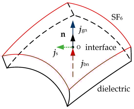 The charge accumulation on the surface of the spacer is influenced by the current density on the spacer bulk side in the vertical direction (jbn), the vertical current density in the gas phase (jgn), and the leakage current on the spacer surface in the horizontal tangential direction (js), as shown in Figure 3. The surface leakage current and time-varying surface charge density ρs can be described as Equations (5) and (6) [] as follows: