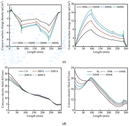 When the positive and negative ion mobility in SF6 and dielectric conductivity are set to the constants in Table 2, the time-varying normal current density, net current density flux, surface charge, and electric field on the concave and convex sides of the spacer are shown in Figure 4. Surface accumulation is a long-term process that needs to be considered on a large time scale, so 500 h, 1000 h, 2000 h, and 4000 h are taken as examples to discuss the charge distribution after different lengths of continuous operation.