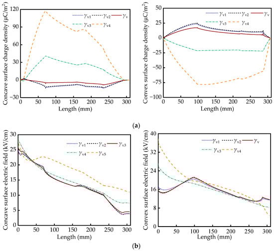 According to Equation (5), it can be seen that in the process of surface charge accumulation, the charge transfer in dielectric and gas-phase charge deposition are in a mutual counteracting effect. Referring to the results of existing experimental studies [], five different levels of conductivity are discussed in correlated with the range of conductivity selected for spacers in existing studies [,,]: γv1 = 2 × 10−15 S/m, γv2 = 2 × 10−16 S/m, γv = 2 × 10−17 S/m, γv3 = 2 × 10−18 S/m, γv4 = 2 × 10−19 S/m, where γv is the conductivity of intermediate grade. When the charge movement at the gas–solid interface reaches a steady state, the surface charge on the surface of spacers with different conductivities is significantly different in polarity and amplitude, as shown in Figure 5a. Spacers with conductivity greater than γv have a little variation in the polarity and amplitude of the charges deposited on their surfaces. In contrast, the polarity of deposited charges on the surface of spacers with conductivity below γv is reversed, and the density of deposited charge increases substantially. This is due to the fact that when the spacer conductivity is greater than γv, the volume current density is still greater than the ion current density from the gas at this time, and the current density of both sides of the interface is similar to that in Figure 4. The polarity of the net current density flux does not change, so the polarity of the accumulated charge on the interface of solid and gas does not change, and it reaches a steady state with only a weak increase in charge density amplitude. In contrast, when the spacer conductivity is less than γv, the steady-state charge on the surface of the spacer not only changes polarity, but the density also increases substantially.
