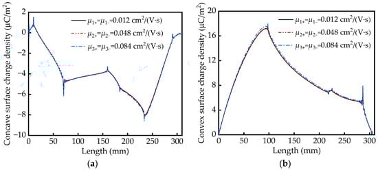 The surface charge distribution of the concave and convex surfaces of spacers under steady state is shown in Figure 6. With the increase in ion mobility, the charges deposited on the concave and convex surfaces of the spacer only increase slightly at the accumulation peak, and there is no reversal in charge polarity. This situation is mainly affected by two factors. One is the change in positive and negative ion mobility, which indirectly affects the ion flow in the gas phase by changing the rate of motion of ions in a strong electric field. Unlike changes in conductivity, changes in ion mobility cannot directly affect the normal current density on the gas side of the interface. Secondly, under a long simulation time span, the current density from the gas side is limited by the number of carriers in the gas-phase space, and changes in the charge migration rate still cannot lead to a rapid increase in the gas-phase current density. In addition, since the charge deposition on the surface of the spacer does not show significant change under steady state, the steady-state electric field along the spacer also does not change significantly for this variable.