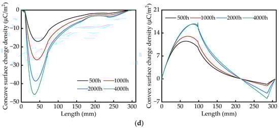 As shown in Figure 4a, on both sides of the concave and convex surfaces of the spacer, the value of normal volume current density (jbn) on the spacer bulk side is larger in magnitude than the value of normal ion current density from the gas side (jgn). The normal current densities on both sides of the gas–solid interface are not continuous, leading to the presence of non-zero net current density fluxes (jbnjgn) (as shown in Figure 4b), which results in the phenomenon of charge accumulation on the demarcation surface. With the change of time, affected by the change of space electric field, the value of ion current density from gas-ion movement gradually increases, while the value of current density from dielectric gradually decreases, and the difference of current density on both sides of the interface diminishes, reaching the current densities on both sides of the gas–solid interface are matched until 4000 h. When the net current density flux tends to zero, the charge accumulated on the spacer also reaches a stable state, and its polarity is the same as the net current density flux in the previous transition process, as shown in Figure 4c. The convex surface of the spacer accumulates the positive polarity charges as the DC excitation is applied to the center conductor, while the concave surface deposits a positive polarity charge only in the small area immediately adjacent to the center conductor, and the rest of the area is covered by negative polarity charge.