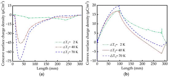 The internal temperature of DC-GIS mainly depends on the current value in the conductor, and different current values correspond to different temperature distributions in the gas–solid phase system. This section mainly introduces three reasonable steady-state central conductor temperatures, which are 295 K, 333 K, and 363 K, respectively. The grounding shell temperature is still 293 K. Therefore, the temperature difference between the central conductor and the grounding shell is ΔT1 =2 K, ΔT2 = 40 K, and ΔT3 = 70 K, respectively [,]. The steady-state temperature distribution on the interface between SF6 gas and the spacer bulk is shown in Figure 8. The closer to the center conductor on the insulating medium, the higher the temperature field on its surface. The temperature gradient between the central conductor and the grounding shell increases as the temperature difference between the conductor and the grounded shell increases. Under different temperature differences, there are obvious differences between the charge distributions on the concave and convex surfaces of spacers at steady state, as shown in Figure 9. The peak value of charge accumulation on the concave side increases continuously with the increase in temperature difference, and the high-density charge accumulation area also gradually moves to the high-temperature area. For the convex side, although the increase in temperature difference slightly increases the peak value of steady-state charge accumulation, the change in magnitude is not significant.