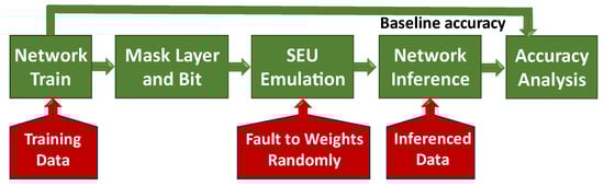 Figure 2 represents the framework of simulation. Firstly, the SEUs were introduced to the LeNet-5 after training was complete. Then, the LeNet-5’s accuracy was re-evaluated with the new weight. Each weight is represented by 32-bit floating point numbers. The number of bits in SEUs were increased to determine how susceptible the LeNet-5 was to weight-related SEUs and to classify the behavior of the LeNet-5 under an increasing number of SEUs. The bits in SEUs were increased from 0 to 225 and the classification accuracy of LeNet-5 was recorded. In total, 50 trials were recorded for each number of bits in SEUs.
