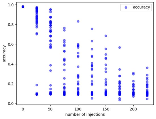The statistical fault injection method in a CNN was discussed [], and the fault injection results of this project were statistically analyzed under experimental conditions. The abscissa in Figure 4 represents the number of fault injections. We will separately analyze the distribution of the network model for different numbers of fault injections to reflect the dynamic changes of the network in orbit. After specifying the number of fault injections x, the sample population of fault injections becomes all combinations of selecting x bits from all weight bits. In our experiment, the sample size was selected as 50. For each combination, when the selected weights are flipped, the CNN inferences a test set of 10 k images and obtains a final accuracy. Then, based on the accuracy, the CNN output situation is classified (for each specific classification, it is a binomial distribution). Therefore, in the case of sampling sample size n, the standard error of the proportion of one output situation of CNN is: