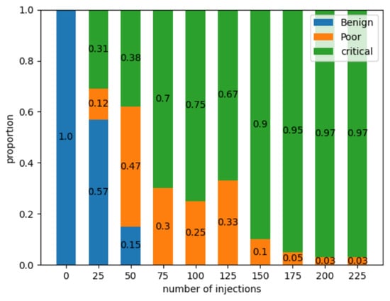 where z and confidence level are related. According to Figure 4, when the injection count is 25 (benign situation accounts for 0.57), the sample size is 50, the confidence level is 90%, the standard error of the benign situation is 0.07, and the confidence interval is [0.45, 0.68]. The errors and confidence interval conditions of the results at other injection counts are even better than this. We believe that such results are acceptable.