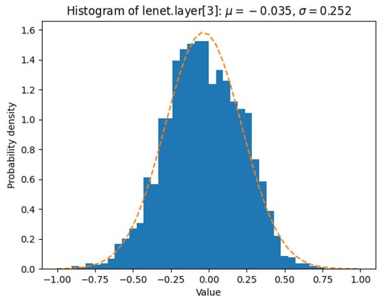 Research has shown that the distribution of weights in CNNs follows an approximately normal distribution with a mean of 0, indicating that the majority of weight values are small []. The weight distributions of the LeNet-5 network are shown in Figure 5 and Figure 6, where Figure 5 represents the weight distribution of the second convolutional layer and Figure 6 represents the weight distribution of the first fully connected layer. Similar patterns can be observed in the weight distributions of other convolutional and fully connected layers.