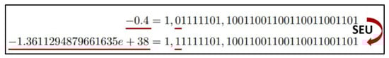 Then, we analyze the probability of SEUs causing a weight to become extreme. The weights discussed in this study are represented as single-precision floating-point numbers, which consist of three parts, as follows: sign bit, exponent, and mantissa. Once a high-order bit of the exponent is affected by an SEU, it can have a significant impact on the value of the floating-point number (IEEE 754), as shown in the example in Figure 7. To obtain the probability of a weight becoming extreme, we first generate a set of data that follows a normal distribution, based on the mean and standard deviation of the weights. Then, we calculate the probability that each number in this set becomes an extreme weight due to SEUs and take the arithmetic average of these probabilities. The resulting probability is 6.7%, which we denote as p4.