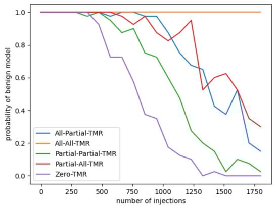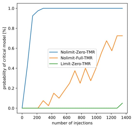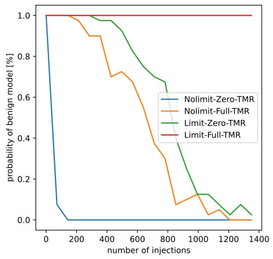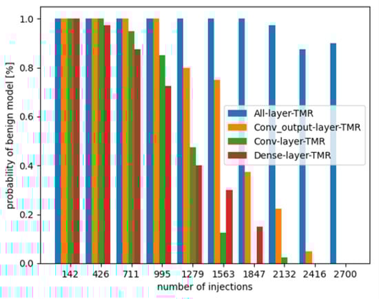 In Figure 8 and Figure 9, weight limiting and Full-TMR are compared as two hardening methods. Figure 8 compares the probability of LeNet-5’s accuracy reaching a critical condition, while Figure 9 compares the probability of LeNet-5’s accuracy reaching a benign condition. The results in Figure 8 indicate that the weight limiting method can effectively eliminate critical conditions, as extreme weights are the main cause of critical conditions. From Figure 9, it can be observed that when the number of SEUs is less than 380, weight limiting significantly improves the proportion of LeNet-5’s benign accuracy, reaching as high as 98%. So extreme weights are also the dominant cause of poor conditions at this stage. As the number of SEUs further increases, the probability of critical conditions remains close to 0% under the weight limiting, but the benign condition starts to degrade. This is because the limiting measures cannot eliminate the small range fluctuations in weights caused by SEUs. Moreover, with an increasing number of SEU faults, the accumulation of small range fluctuations in weights gradually has a greater impact on LeNet-5’s accuracy.