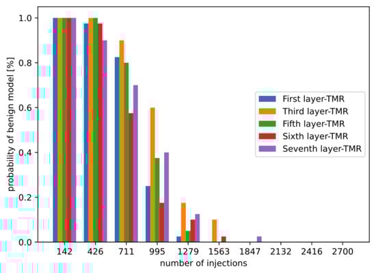 To identify the critical layers of LeNet-5, first, TMR is applied to the weights of different layers individually. Then, SEU faults are randomly injected into the weights of all layers; the accuracy results of LeNet-5 are shown in Figure 10. Figure 10 shows the results of TMR hardening applied to the weights of each layer in LeNet-5 and there is no apparent dependency on the effectiveness of TMR across different layers. Considering the number of weights in each layer, as given in Table 1, the first layer, the third layer, and the seventh layer show the highest efficiency in hardening. This means that significant improvement in LeNet-5’s accuracy can be achieved by applying TMR to a small number of weights in these three layers. Therefore, these three layers are defined as the critical layers. Figure 11 compares the hardening results of all layers, critical layers, convolutional layers, and fully connected layers. The results show that the TMR of the critical layers has a significantly better effect than the convolutional layers and fully connected layers.