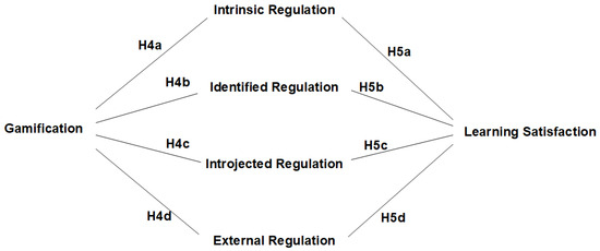 In the metaverse learning experience, learning motivation (intrinsic regulation [H5a], identified regulation [H5b], introjected regulation [H5c], and external regulation [H5d]) play a mediating role in the relationship between gamification and learning satisfaction.