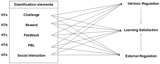 External regulation mediates the relationship between gamification elements (challenge [H7a], reward [H7b], feedback [H7c], PBL [H7d], and social interaction [H7e]) and learning satisfaction.