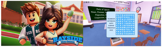 We conducted a survey to investigate the impact on and extent of each gamification element of intrinsic motivation, external motivation, and learning satisfaction, as shown in Figure 5. Participants were invited to experience a metaverse learning scenario online, specifically the highly popular learning environment, Bayside High School, created by Double Bandit Studio in Roblox, as shown in Figure 6. Before the formal experience, participants had one week to freely explore this learning environment, ensuring their familiarity with it. All participants were required to use a computer for the experience, eliminating potential device-related impacts. In the metaverse learning experience, participants could freely explore the entire learning scenario, earn points by completing relevant tasks in Bayside High School, and use these points to redeem personalized decorations. Participants received real-time feedback in the scenario, tracking of their learning progress, with PBL elements also integrated. In order to ensure changes in learning motivation, participants spent at least one hour in the formal experience. The learning experience was followed by a survey for participants.