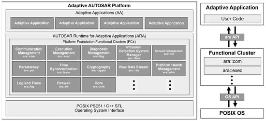 The overall architectural logical view of Adaptive AUTOSAR is shown on the left side of Figure 1 []. Adaptive Applications (AAs) are located in the top layer. AAs run on AUTOSAR Runtime for Adaptive Applications (ARAs). ARAs consist of Platform Foundation Functional Clusters (FCs), and they also include Adaptive Platform Services and Standard Application/Interfaces, although they are not shown in the figure. FCs provide the fundamental functions of Adaptive AUTOSAR. Additionally, as the AP release continues to evolve, new FCs are being added.