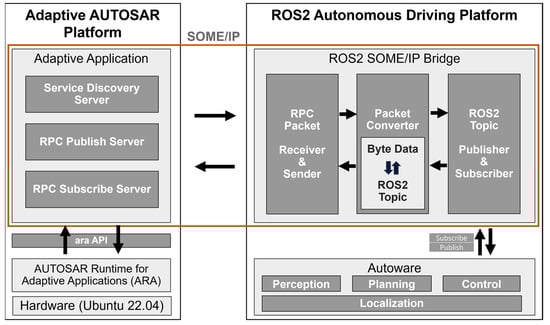 ROS2 addresses the limitations associated with the research-focused nature of ROS1 by incorporating the Data Distribution Service (DDS) [], which is a standard used in the military and aviation industries for Service-Oriented Communication (SOC). Additionally, the introduction of DDS Real-Time Publish Subscribe (DDS-RTPS) enables real-time control under the assumption of well-structured code. These innovations demonstrate the potential of ROS1 to move beyond its limitations and progress industrially. For instance, Apex successfully developed a high-safety solution that met the requirements of the ASIL-D level of the functional safety standard for electrical and/or electronic systems (ISO 26262) based on ROS2 [,]. This trend has led various ROS1 autonomous driving projects to transition to ROS2; Autoware [] is a prominent example of this trend. Autoware is an open-source project that encompasses essential autonomous driving functionalities such as perception, decision making, and control []. It is currently being tested on various testbeds, including autonomous buses, shuttles, and Autonomous Valet Parking, with ongoing development toward the activation and commercialization of autonomous driving technologies. However, for consumers to use autonomous vehicles in daily life, stringent conditions must be met. Almost all vehicle companies currently adhere to the AUTOSAR standard. This indicates that there is a notable gap between the research and development of autonomous driving technologies and their application in actual vehicles. To leverage the strengths of each platform and mitigate its weaknesses, interoperability between Adaptive AUTOSAR and ROS2 platforms must be ensured in a form that can be realistically applied in the automotive industry.