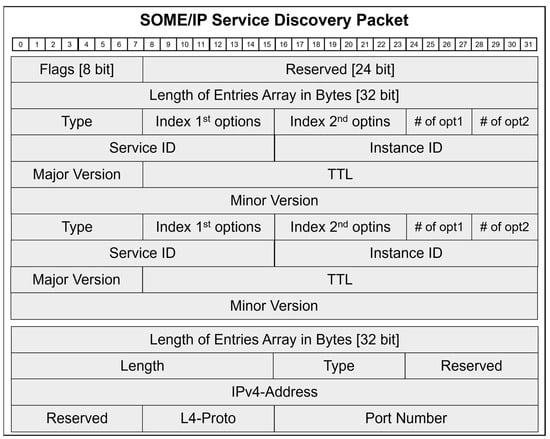 - AUTOSAR, R21-11; SOME/IP Service Discovery Protocol Specification. Available online: https://www.autosar.org/fileadmin/standards/R20-11/FO/AUTOSAR_PRS_SOMEIPServiceDiscoveryProtocol.pdf (accessed on 13 March 2024).
