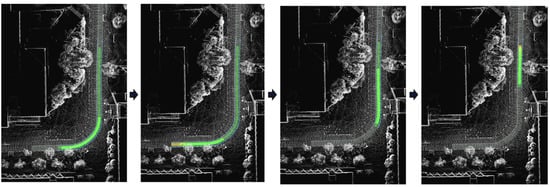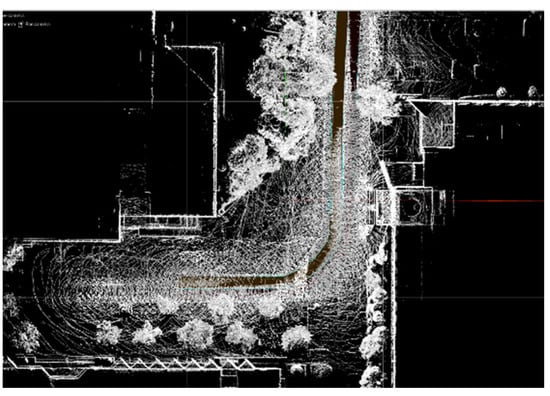 The results of the SLAM are shown in Figure 7. We created a three-dimensional map of points, which was used in the Localization and Perception process in Autoware. Along with the Point Cloud Map, a Vector Map was constructed, and it is shown in the figure. The Vector Map used a Lanelet2 format that contained the location information for the road on which the vehicle could drive, such as left and right lanes, stop lines, traffic lights, and the various constraints required for driving. Using TIER V4’s Vector Map Builder [], we constructed a Vector Map containing road information for use in the verification of the simulation. In Figure 8, the yellow-colored part of the overlapping Point Cloud is the area where the vehicle could drive.