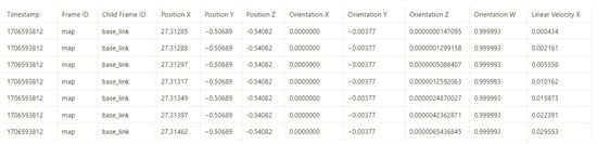 Figure 10 shows some of the acquired Odometry Data converted to a CSV file with a timestamp. Some Linear Velocities and accelerations are omitted for readability in Figure 10. When a request is received from ROS2 SOME/IP Bridge, the CSV file is read row by row to simulate the acquisition of the vehicle’s location information. The X, Y, and Z positions of the vehicle are based on the UTM coordinate system using a latitude of 37.5422 and a longitude of 127.0785 as the origin. Odometry Data also contain Orientation X, Y, Z, and W values to indicate the Orientation of the vehicle, as well as Linear Velocity and Angular Velocity.