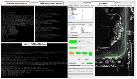 The ROS2 Autonomous Driving Platform section was implemented using Autoware, which is an open-source autonomous driving software platform based on ROS2, and an ROS2 SOME/IP Bridge proposed in this study. Autoware includes all the necessary components for operating autonomous vehicles, such as sensing, localization, perception, planning, and control. It also provides its own simulation environment. In this study, the Autoware’s simulation environment was used to implement and verify the integration between the Adaptive AUTOSAR Platform and ROS2.