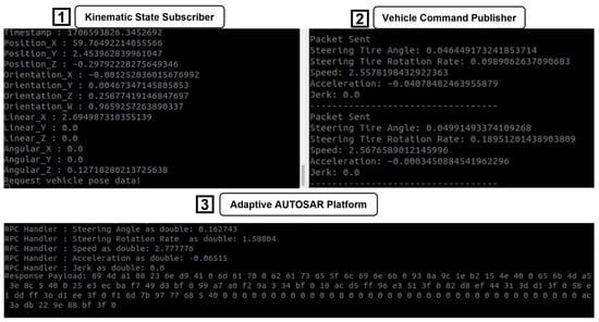 Figure 14 displays a terminal outputting data exchanged during a simulation. In the top left of the figure is the Kinematic State Subscriber, which shows data exchange on Terminal 1. It receives the vehicle’s Position, Orientation, Linear Velocity, and Angular Velocity from the Adaptive AUTOSAR Platform and converts them into ROS2 messages for publishing. As shown on Terminal 1, it receives packets containing the vehicle’s position X, Y, and Z, Orientation X, Y, Z, and W, along with Linear and Angular Velocity, and analyzes the payload to produce results.