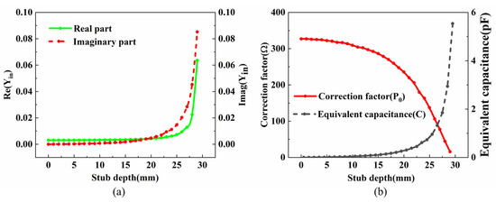 If the influence of the stub itself on the equivalent circuit is not considered, the real part of the input admittance in Equation (3) is theoretically a constant value. However, the ideal constant value cannot be achieved. For instance, a WR340 waveguide with a single stub is taken into consideration. The radius of the stub used is R = 3.5 mm, and the length of waveguide is l = 75 mm. When the microwave frequency f = 2.45 GHz, the phase constant β = 36.258 rad/m, and the characteristic impedance of the rectangular waveguide Z0 = 328.9 Ω. Figure 3a shows the simulated input admittance of the WR340 single-stub waveguide. It can be seen that the real parts of the input admittance with different stub depths are not fixed. The greater the stub depth, the larger the real parts of the input admittance. Therefore, due to the influence of the stub itself, the single-stub waveguide cannot be regarded as an ideal equivalent circuit as shown in Figure 2b [29]; otherwise, the calculated results may be inaccurate. One can approximate the input impedance at a waveguide port using the ratio of equivalent voltage to equivalent current. When the stub depth is 0, the equivalent load impedance ZLe can be calculated by [28]