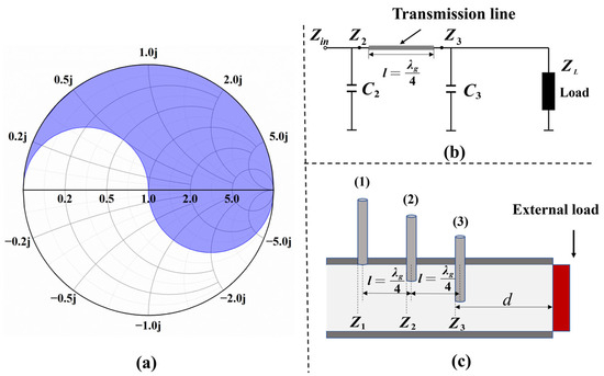 The matching circuit generally has a matching forbidden zone, and the Smith chart is divided into two regions, the upper half region and the lower half region, as shown in Figure 5a and Figure 6a. For the load value in each area, a simple distributed matching circuit can be applied to complete the impedance matching [30]. Figure 5b can be used to match the load in the upper half of the Smith chart, and Figure 6b can be used to match the load in the lower half of the Smith chart. Each matching circuit contains two capacitors, and the length of each transmission line in the matching circuit is a quarter wavelength of the waveguide.