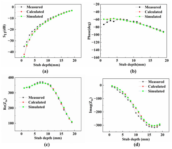where ε is the error between the calculated value of the input impedance and the measured value, is the calculated value, and is the measured value. The experimental results of the input impedance at different stub depths basically match with the calculated results, with an error factor ε not exceeding 0.1.