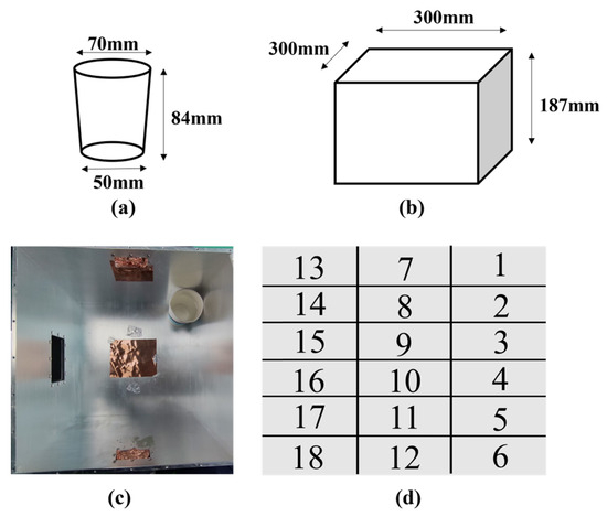 (a) The size of the paper cup in the cavity. (b) Dimensions of the cavity. (c) The interior of the cavity. (d) The order of moving paper cups.