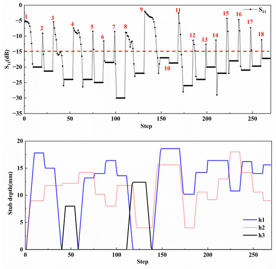 As shown in Figure 20a, at the initial position, the stub depth is 0; that is, the first matching process is initial state matching. We can see that the reflection is basically decreasing, and there is no large reflection in this process. When load mutation occurs, it is an online state matching process, and the reflection can be gradually reduced by adjusting the stubs in sequence, avoiding the large reflection in the tuning process.