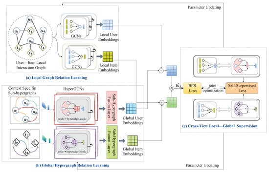 Here, is implemented by a multi-layer perceptron network with learnable weights and a activation function. is the learning weight. It is used to determine the importance of each sub-hypergraph’s contribution to the final aggregated representation. By aggregating the node features obtained from sub-hypergraphs in the user and item domains separately, we can obtain versatile representations for both users and items. These representations are denoted as and . Then, the embeddings from multiple layers are added together to comprehensively capture features and patterns at different levels. This effectively reveals the complex relationships and semantics in the hypergraph. The final user and item embedding are updated by combining the hypergraph-based representations with the local-aware graph relation embeddings, refined as . Finally, the prediction of user liking item is determined by computing the inner product, .