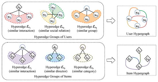 Recently, the graph neural network (GNN) [] has shown great power in graph representation learning. The utilization of GNNs facilitates the exploration and learning of the complex interaction patterns between the user’s social graph and the user–item rating graph. Consequently, integrating GNN models into the user–item representation learning framework has emerged as a natural approach to enhance social recommendation models [,]. However, in real-world applications, data structures often extend beyond simple pairwise connections. This introduces increased complexity in processing and modeling complex high-order data dependencies.
