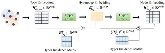 After acquiring sub-hypergraphs with diverse relationship patterns, we introduced a global-aware relation encoder utilizing hypergraph convolution []. Formally, the k sub-hypergraph for items is denoted as . represents the hyper-embeddings of items in the k-th sub-hypergraph representation space at the l-th propagation layer. Our hypergraph message propagation and aggregation layer is formulated as follows: