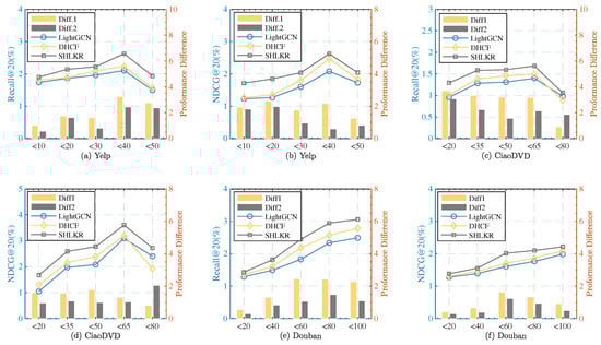 To further validate the model robustness, we conducted experiments across multiple data splits to ensure the replicability and consistency of the study results across different training data scenarios. Specifically, we partitioned the dataset into subsets with different interaction ratios and trained the model with varying levels of sparsity. The x-axis ticks of Figure 4 provide specific sparsity settings. We then compared SHLKR with the hypergraph-based method DCHF and GNN-based method LightGCN. Additionally, we assessed the performance differences between SHLKR and these two baselines. The results are depicted in Figure 4. We observed that SHLKR’s performance is consistently superior to LightGCN and DCHF across datasets with different sparsity levels. This result validated the robustness of SHLKR in handling sparse data in the training data. The reason is that our hypergraph learning model can learn high-order relationships through global relation learning, thereby alleviating the impact of sparsity in the observed user–item interaction data. Additionally, the self-supervised learning task extracts knowledge from refined graph views, providing additional supervised signals to enhance embedding learning.