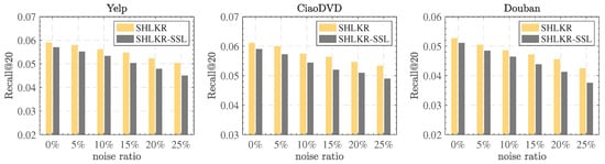 In SHLKR, we introduced a self-supervised learning task to enhance node representation learning and improve the model’s robustness against noise. To evaluate the effect of the self-supervised learning task on model performance, we introduced different proportions of noise data to the training set. Specifically, the ratio was set to 5%, 10%, 15%, 20%, and 25%. We then compared the performance of our proposed SHLKR model with a variant model without the self-supervised learning task (SHLKR-SSL) using the metric Recall@20. The experimental results are shown in Figure 5. We found that noise data had a negative impact on model performance. However, SHLKR consistently outperformed SHLKR-SSL. This observation indicated that SHLKR consistently demonstrates robust performance at different noise levels. The reason is that the auxiliary task can help SHLKR learn valuable data patterns from cross-view supervision signals. It will enhance the model’s stability to noisy edges in graph learning. Figure 6 illustrates the distance distribution of user and item embeddings in two-dimensional space achieved through t-SNE visualization. We observed distinct clusters and a clear separation in the embeddings’ distribution generated by SHLKR. This further validates the advantage of the self-discrimination task in SHLKR.