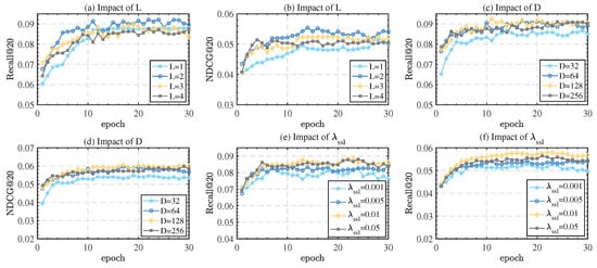 Initially, we changed L from 1 to 4 to assess the influence of graph model depth on SHLKR. The results of Figure 7a,b indicate that the model achieves its best performance when . This result suggest that a relatively shallow graph model is capable of extracting valuable high-order semantics. However, as the model depth increases further, its performance deteriorates. This decline may be due to the over-smoothing caused by the stacking of propagation layers. It will further amplify the impact of edge noise. Figure 7c,d demonstrate that the model achieves its highest performance with a Recall@20 of 0.09251 and a NDCG@20 of 0.0604 when the embedding size is set to . This means setting a small embedding size may prevent the model from capturing sufficient features. As a result, it will affect the generalization capacity of the model to unseen data. Figure 7e,f show the affect of on the model performance. The optimal performance is achieved when , striking a balance between the main recommendation task and the auxiliary task. When is too large, the auxiliary task will have a stronger influence on parameter learning, thus affecting the main task. On the contrary, it may lead to insufficient learning on the auxiliary task.