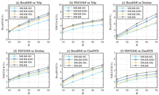 Performance comparisons of different variant models of SHLKR across three datasets: (a,b) Yelp, (c,d) Douban, and (e,f) CiaoDVD.