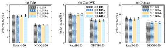 To analyze the effects of different hyperedge types in the user and item channels on SLHKR’s performance, we designed the following ablation experiments. We gradually removed different hyperedge types, generating three variants of SLHKR. The variant SHLKR-s has social context-based hyperedges in the user channel removed. This means that the model cannot leverage high-order relationships from social connections. SHLKR-b has the behavior-context-based hyperedges in both the user and item channels removed. This means that the model cannot utilize high-order relationships from user–item interaction behaviors. SHLKR-a has the attribute-context-based hyperedges eliminated. As a result, it loses the ability to leverage external knowledge derived from the attribute graph.