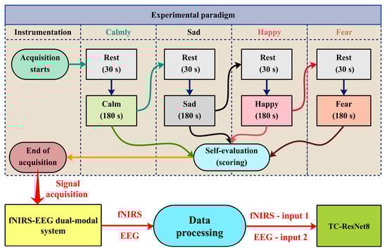 Our cross-disciplinary research effort has culminated in the creation of a state-of-the-art dual-mode wearable device. This device seamlessly merges fNIRS with EEG, allowing for the precise detection and interpretation of users’ emotional states. With its lightweight and modular design, multiple channels, wireless capabilities, and straightforward operation, the fNIRS-EEG system comprehensively addresses the portability challenges inherent in conventional devices. This study pioneers the introduction of TC-ResNet technology into emotion recognition. By integrating this cutting-edge technology, our system has achieved breakthrough improvements in both accuracy and response speed, substantially outperforming traditional and single-modality models. The data preprocessing stage has been approached with meticulous attention to detail. We have conducted a thorough quality check of the fNIRS signals, transforming raw intensities into the concentrations of HbO and HbR, and filtering out the movement artifacts and physiological noise filtering. The EEG signal processing has likewise been fortified by the inclusion of re-referencing, filtering, rigorous visual artifact inspection and removal, interpolation for compromised channels, and ICA, all contributing to the integrity of our brain signal collection. Our conclusive findings, derived from an extensive evaluation encompassing 30 subjects and four emotion induction protocols, demonstrate that our bimodal system achieves a stunning 99.81% classification accuracy. The fusion of fNIRS and EEG signals not only confirms their interconnectivity, but also establishes the superiority of our bimodal system compared to their single-modal counterparts, which saw accuracy increments of 0.24% for EEG and 8.37% for fNIRS when used independently. Furthermore, our dual-modal approach utilizing TC-ResNet trumps conventional fNIRS-EEG fusion techniques, improving recognition accuracy by a significant margin of up to 32.98%. Our pragmatic and carefully articulated emotional detection system paves the way for a revolutionary shift in personalized healthcare, adaptive learning ecosystems, and enhanced human–computer interaction frameworks. The outcomes of this work hold promising potential for future advancements in the fields of emotion analysis and emotion–brain–machine interface development, reshaping the frontiers of how emotional responses are perceived and utilized.