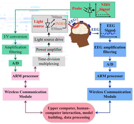In this system, fNIRS and EEG signals are collected separately and subsequently analyzed on the upper computer to simplify the research process and enhance the reproducibility of the research. The upper computer can perform real-time data processing and analysis, allowing researchers to obtain prompt preliminary results. This straightforward operation saves considerable time and effort for researchers, ensuring consistency and comparability between experiments. Furthermore, this approach reduces interference between signals, thus enhancing the quality and reliability of the data.