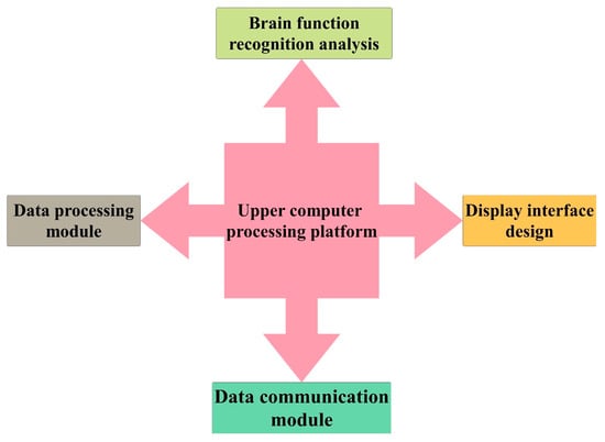 The upper computer processing platform plays a critical role in the system, with a design that includes data communication, data processing, display interface design, and brain function recognition analysis (see Figure 6). This segment is integrated using Python 3.9 and Visual Studio 2019, enabling tasks such as data communication, data processing, display interface design on Visual Studio, and data calculation, feature extraction, and classification recognition training on Python to be handled. A serial port connects the data communication segment to the hardware detection platform via a serial port. Communication content primarily involves three components, namely, configuring communication ports; verifying the correct functioning of the communication port, sending different signals to control the hardware platform’s start, pause, and stop; as well as receiving and parsing fNIRS and EEG data packets. Data are sent to the upper computer from the hardware platform, the former of which parses and checks the data, separating fNIRS and EEG data channels based on the timing of light signals and data acquisition. During data parsing, different wavelengths of weak signals are separated based on timing. The data processing segment involves more accurate fNIRS and EEG data filtering. Due to the relatively gradual changes in blood flow, variations in the direct current (DC) component of optical data in fNIRS are indicative of shifts in cerebral oxygenation levels. Hence, it is frequently essential to include the DC component in the analysis as a reference for establishing the baseline optical density level. Simultaneously, meticulous processing is imperative to prevent the inclusion of artifacts resulting from head movement or other factors unrelated to cerebral blood flow. Additionally, under specific circumstances, analyzing alternating current (AC) components may prove necessary to identify swift physiological changes linked to heart rate and respiration. This procedural step aids in noise removal, ensuring a clear signal for the precise extraction and interpretation of brain activity data. Meanwhile, with EEG data, high-frequency noise and DC components containing data from 1 Hz to 50 Hz are removed. Changes in brain oxygen levels are calculated using the modified Beer–Lambert law to estimate changes in HbO and HbR. Analysis of brain function recognition includes feature extraction and analysis of brain oxygen, EEG feature extraction, feature fusion, and the development of classification recognition models.