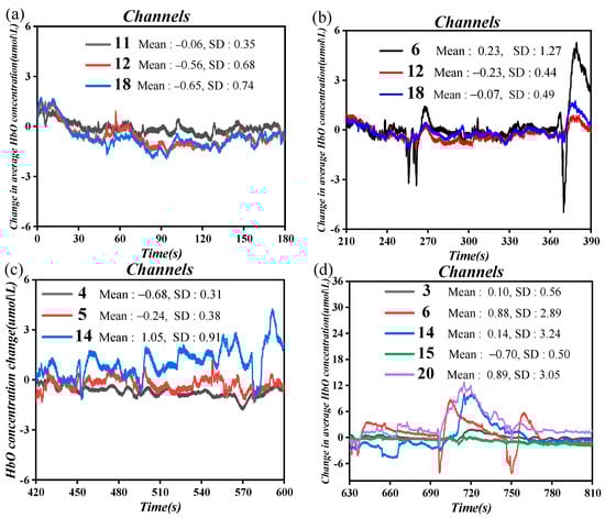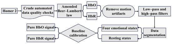In this study, we utilized the HomER2 toolkit—a MATLAB R2022a-based GUI program—to analyze and preprocess fNIRS data [25], as depicted in Figure 7. Initially, we conducted an automatic data quality assessment using the ‘enprun-channels’ function, which removed any channels with insufficient or overly robust signals, or with large standard deviations, to safeguard data quality [25]. Following that, we transformed raw light intensities into concentrations of HbO and HbR based on the modified Beer–Lambert law [26]: