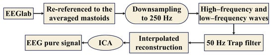 This study employs the EEGlab data preprocessing tool—complete with a comprehensive function library—for the offline analysis of EEG data [32], executed in five distinct phases (see Figure 8). Initially, the data are re-referenced to the average mastoid potential and downsampled to a 250 Hz sampling rate [33]. The EEG signal after re-referencing can be expressed as as follows: