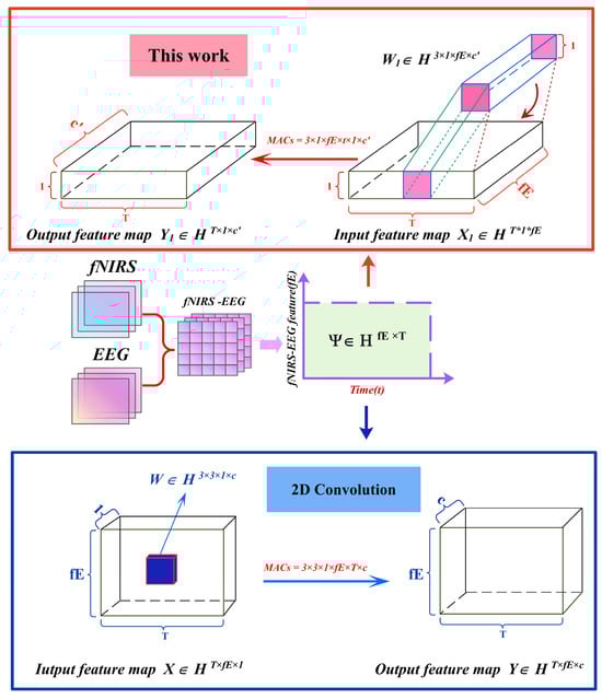 To develop a quick and accurate real-time emotion recognition model, we must consider the fNIRS-EEG data acquired in each frame separately within a set of time series data. We set , , to obtain . The new tensor is then used as an input to the temporal convolution with weights . Meanwhile, the output feature map is . In this work, a temporal convolution is proposed that can overcome the issues associated with existing convolution operations, which are computationally intensive, run slower, and use a high memory overhead (see Figure 10).