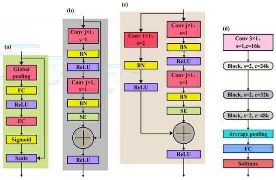 Figure 11 shows that our framework is based on the TC-ResNet8 model. The model contains three residual blocks, with each layer having channel numbers of 16, 24, 32, and 48, including the initial convolutional layer. A shortcut is directly applied to achieve efficient emotion recognition when the dimensions between input and output match, which can be seen in Figure 11b. When dimensions differ, an additional conv-BN-ReLU module can be used for dimension matching, as presented in Figure 11c. We used a variety of kernel sizes to improve the model’s focus and extraction capabilities for distinct emotional critical information (j × 1, where j = 3, 5, 7, 9). This design allows the network to autonomously determine the appropriate kernel size for each layer. As shown in Figure 11a, the well-established Squeeze-and-Excitation (SE) structure is seamlessly incorporated into the block. Furthermore, we introduce a width multiplier, denoted as , facilitating the adjustment of channel numbers in each layer. This feature enables an appropriate model capacity to be selected based on specific constraints.