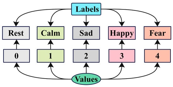 As can be seen in Figure 12, emotions such as rest, calmness, sadness, joy, and fear were assigned numerical labels of 0, 1, 2, 3, and 4. This was performed for every sample in the fNIRS-EEG dataset. A sliding window approach was used to extract features from fNIRS and EEG data, with the critical parameters being detailed in Table 5. To determine the label for the current window, the mode of all labels within that window is determined. If a unique mode emerged, it was assigned as the label. Meanwhile, when there are two modes indicative of a transitional emotional state (rest), the label for the current window was set as the last-occurring mode. Each sample was treated as an individual data point, developing a multidimensional time series input of dimensions (n_sample, n, n_features), in which n represents the number of samples continuously extracted for the current state. An additional dimension was appended to both inputs, with seq_len set to 1, following identical processing for fNIRS and EEG data. They were then entered into TC-ResNet8.