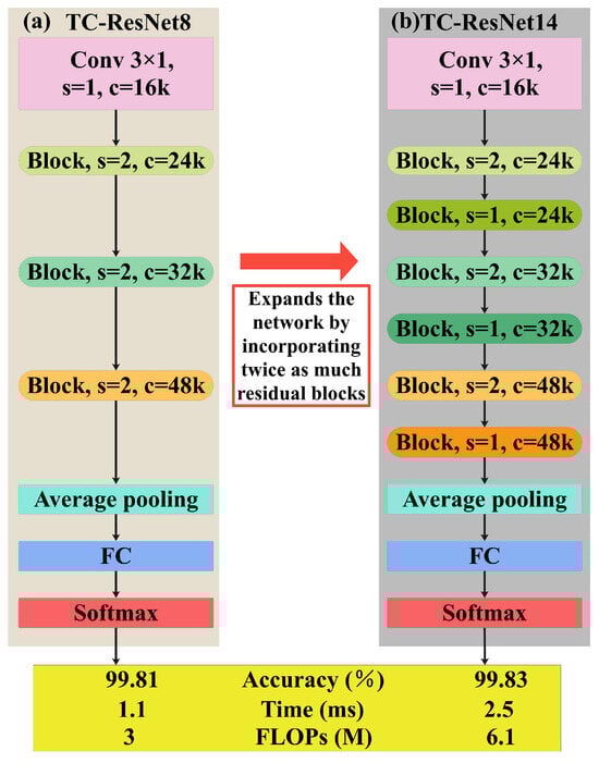 In Figure 18, we expanded the network by incorporating more than twice the number of residual blocks than TC-ResNet8, yielding TC-ResNet14. Interestingly, the TC-ResNet8-1.5 signifies an expansion of the width multiplier of the TC-ResNet8 model to 1.5, enabling models with channel numbers {24, 36, 48, 72}, respectively, to be developed. Similarly, TC-ResNet14-1.5 indicates an extension of the width multiplier of the TC-ResNet14 model to 1.5, generating models with channel numbers {24, 36, 48, 72}. We also enhanced the TC-ResNet8 model by incorporating traditional 3 × 3 2D convolutions, facilitating the development of the 2D-TC-ResNet8 model. We then introduced an average pooling layer after the first convolutional layer, to reduce the number of operations and minimize accuracy loss on this model, resulting in the improved TC-ResNet8-pooling model. The comparison of accuracy, time, and FLOPs performance metrics for these variant TC-ResNet models can be seen in Table 9.