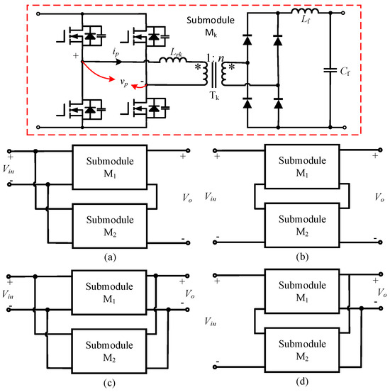 When the PSFB converter is applied to high-power and high-voltage gain applications, its primary-side switching tubes and secondary-side rectifier diodes will be subjected to large current–voltage stresses [14]. The series-parallel combination of several basic PSFB converter modules is an efficient way to extend power capacity. The series-parallel PSFB converter is a system whose power capacity can be expanded by connecting the input and output terminals in series or parallel [15]. In addition, the reliability of the converter can be increased by using redundant modules [16]. According to the way of connecting the input side and output side, series-parallel combination converters can be categorized into four types, i.e., input-parallel-output-parallel (IPOP) converter, input-parallel-output-series (IPOS) converter, input-series-output-parallel (ISOP) converter, and input-series-output-series (ISOS) converter [17]. Each combination of converters has its characteristics and areas of application. IPOP converters can expand the power capacity of a system by connecting two sub-modules in parallel on the input and output side. IPOS converters not only allow for a larger power transfer but also for a higher output voltage gain [18].