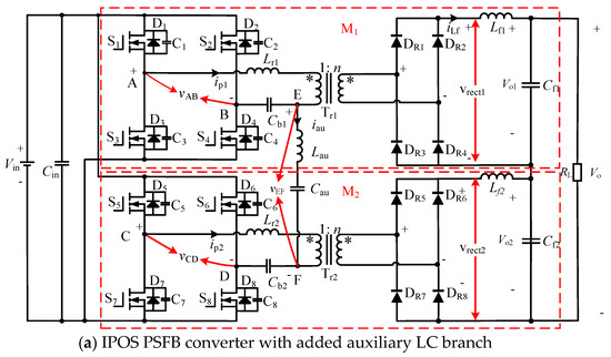 In Figure 3a, S1-S4, S5-S8, DR1-DR4, and DR5-DR8 form the inverter H-bridge and rectifier H-bridge of the sub-modules M1 and M2, respectively. Lr1 and Lr2, Cb1 and Cb2, ip1 and ip2, and Vo1 and Vo2 are the resonance inductance (or transformer leakage inductance), the isolation capacitance, the primary-side currents, and the output voltages of the sub-modules M1 and M2, respectively. Vin and Cin are the input voltage and input capacitance of the IPOS PSFB converter. Lf1, Lf2, Cf1, Cf2, iLf1, iLf2, Vo1, Vo2, Vrect1, Vrect2, and RL are the filter inductors, filter capacitors, currents flowing through the filter inductors, output voltages, the rectified output voltages, and load resistors of the submodules M1 and M2, respectively. Lau, Cau, vEF, and iau are the inductance and capacitance of the auxiliary branch, the voltage across the auxiliary branch, and the current flowing through the auxiliary branch, respectively.