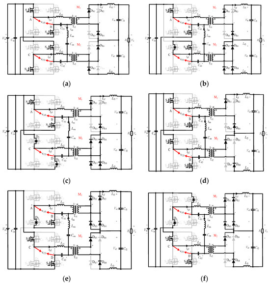 When the difference in parasitic parameters between the sub-modules of the series-parallel PSFB converter is not considered, the input voltage of each sub-module should be equal. Therefore, the series-parallel PSFB converter with the addition of the auxiliary circuit LC has the same operating principle as the main circuit and the same operating state of the auxiliary circuit as the IPOS PSFB converter. Therefore, this strategy is applicable in all four series-parallel PSFB converters under interleaved synchronous drive.