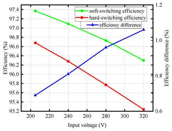 To further analyze the efficiency improvement of IPOS phase-shifted full-bridge converter lagging-leg realizing ZVS versus not realizing ZVS, at a rated power of 100 kW, a loss analysis is conducted under various working conditions after determining the main circuit parameters. The losses of each component in the module are shown in Table 1, and the efficiency and efficiency difference curves of the lagging-leg realizing ZVS and the non-realized ZVS module at input voltages of 205 V-320 V are shown in Figure 5. Figure 5 shows that the higher the input voltage, the lower the efficiency because of the increased switching losses in the active switch and iron losses in the transformer. It can also be seen that the percentage difference in efficiency between the lagging-leg achieving zero-voltage turn-on and not achieving zero-voltage turn-on increases gradually as the input voltage increases the percentage efficiency difference is 1.09 when the input voltage is 320 V. That is to say, realizing zero voltage turn-on of the lagging-leg improves the efficiency more when the input voltage is higher.